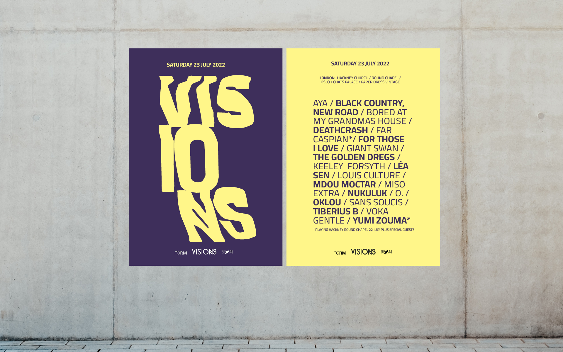 Visions is a music festival platforming experimental and up-and-coming artists. Visions wanted a style for their 2022 festival which reflected the nature of the artists on the bill, and to appeal to the East London millennial creatives it caters to.